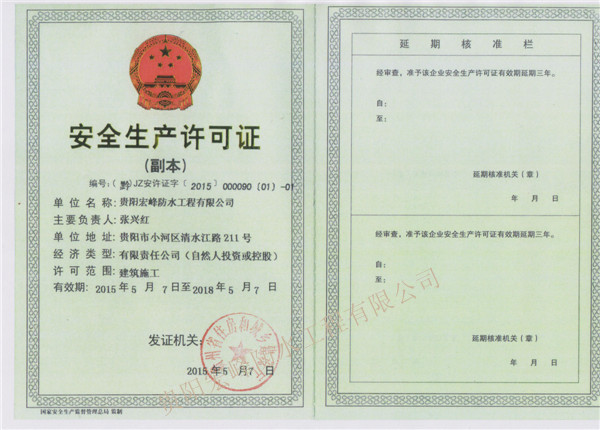 宏峰公司属国家防水防腐保温工程专业承包贰级资质企业,经贵州省住房和城乡建设厅考核合格