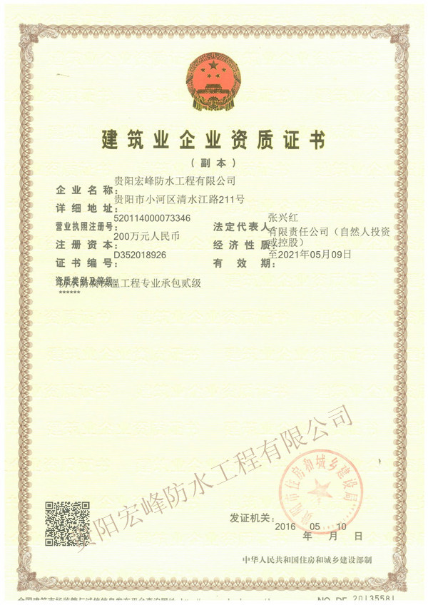 宏峰公司属国家防水防腐保温工程专业承包贰级资质企业,经贵州省住房和城乡建设厅考核合格