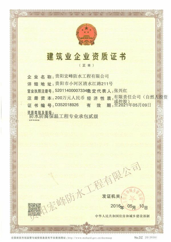 宏峰公司属国家防水防腐保温工程专业承包贰级资质企业,经贵州省住房和城乡建设厅考核合格
